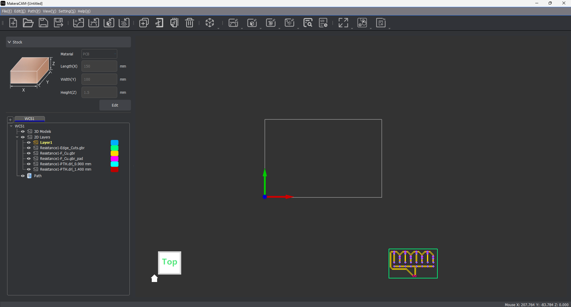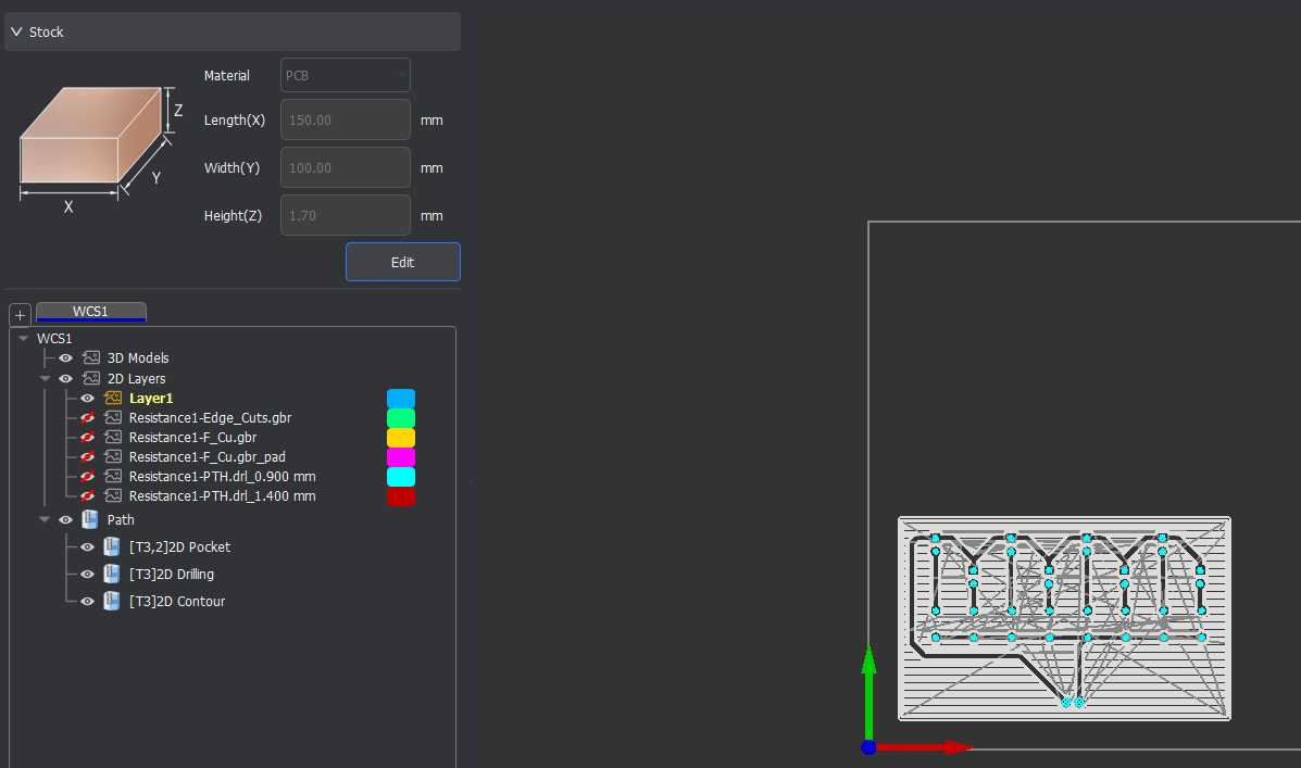 Under “2D Layers” menu, hide (eye with red cross through) all but file with outside cut (Resistance1-Edge_Cuts.gbr)