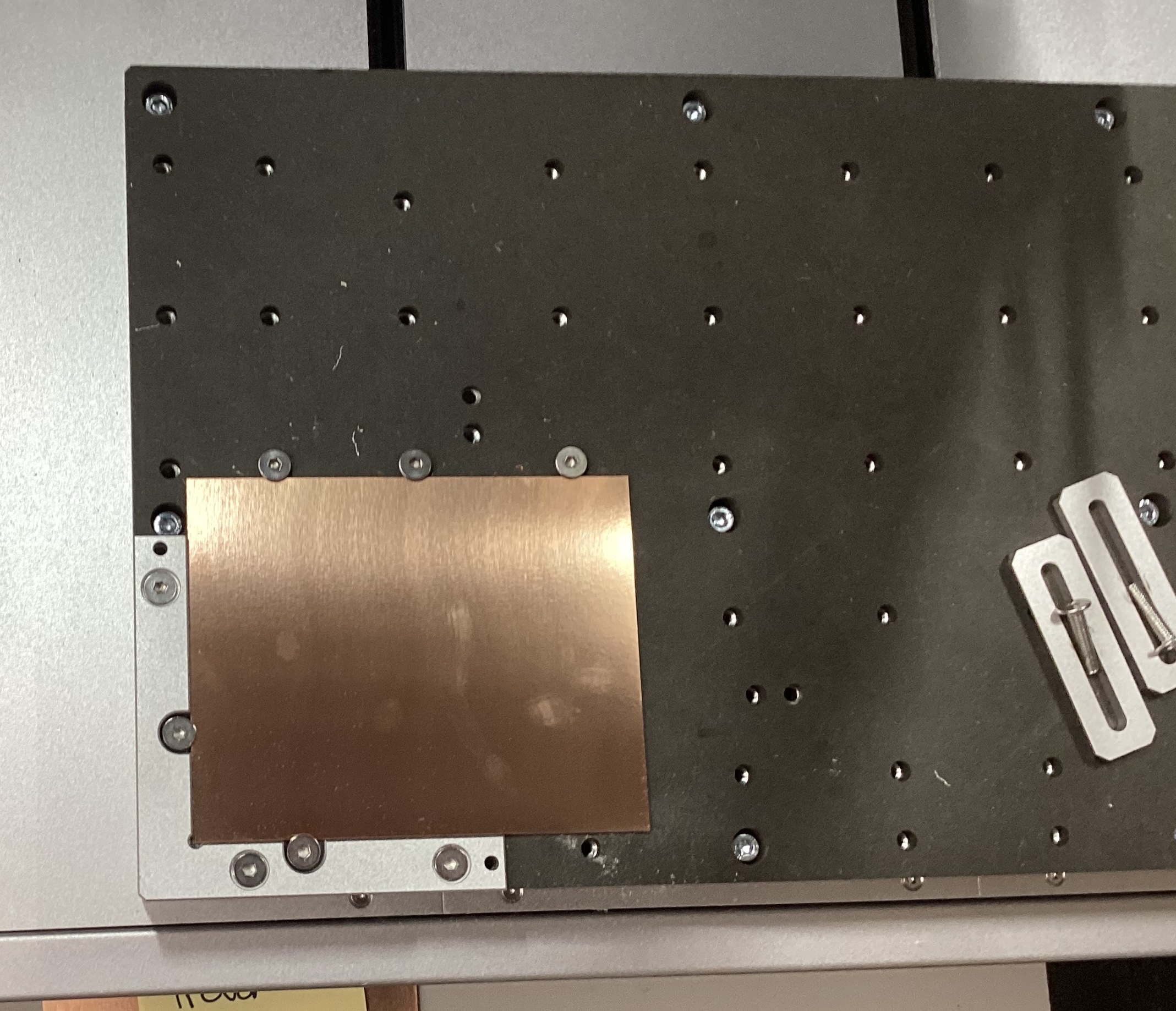 Move/rotate both rectangular metal back so that short end of rectangle with slot aligns with material (holding it down)