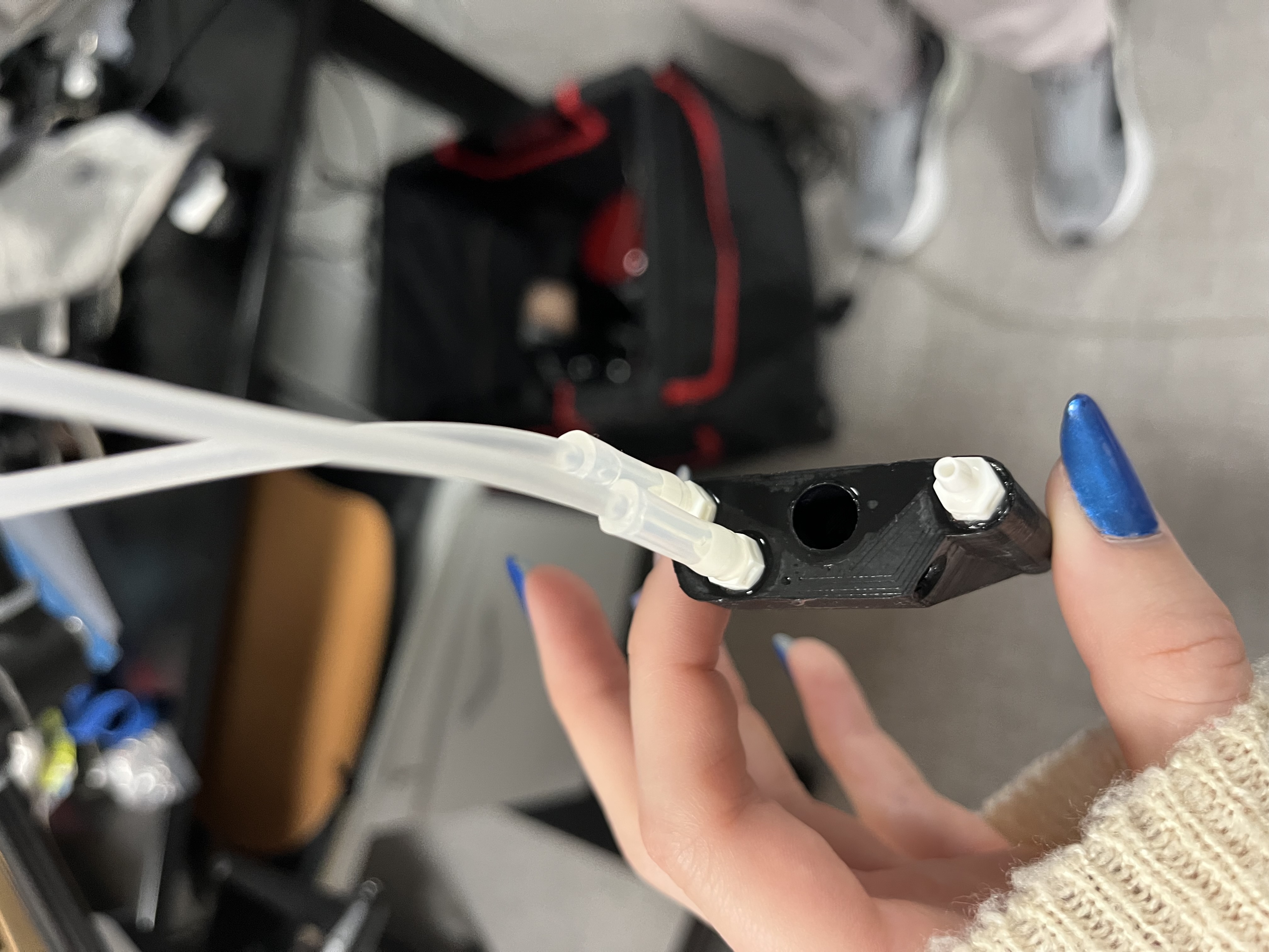 I then printed this new file becuase I needed a set of mouthpieces to give to the hospital to test. I printed them, and there was a Zshift that occured dring printing. I think that the back of the printer hit the wall while it was printing at one moment, and shifted the machine. I also noticed that the connector ends weren’t coming out nice as clean. There were some that had gaps, some where the filament had drooped or slanted, and I worried that the tube wouldn’t fit onto them. I went back to Bambu with this new file and pressed “Add Tree Supports.” I thought that it would help stabilize the connector ends so the filament wouldn’t droop. This automatic support addition filled in some of the holes in the mouthpiece, and I worried that I wouldn’t be able to remove it and air wouldn’t be able to move well through the tubes. I took away the supports and instead used “Add Manual Tree Supports.” I then manually painted supports underneath each connector end. This would make supports only print directly underneath the connector ends. It looked good in the preview section, and I printed this new file. Below is a picture of the mouthpieces in the preview section, flush against the plate and with the manual supports: