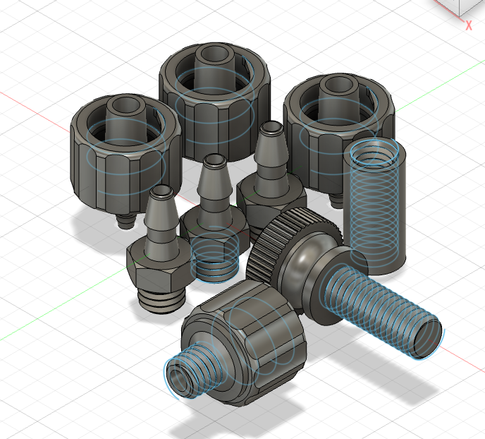 I decided I needed to size up the mouthpieces.I went into Bambu and opened my original QuadStick file. I increased the X, Y and Z dimension up by 0.1 mm. I saved this back to Fusion. I then realized that all of the screws I had saved wouldn’t be necessary for every mouthpiece. I would need 3 (for 3 hole) or 4 (for 4 hole) of the Nylon Tube Fitting Barbed Adapters for every mouthpiece as well as 1 Nylon Thumb Screw per mouthpiece. The thumbs screw would need to be printed seperately and could not be installed as this is used to tighten the mouthpiece on and off of the technology.