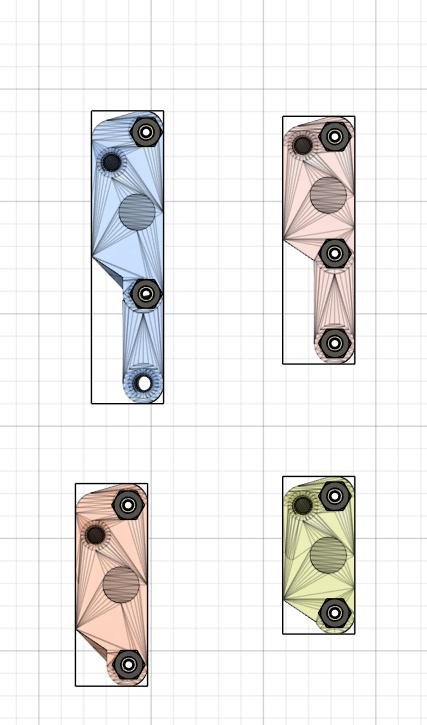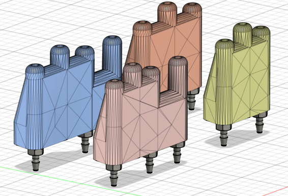I then created a file containing all four variations; it can be found here. This file can now be used to mass-produce these mouthpieces, and the rehab center can do so as well once they have their own 3D printers. To ensure patient and staff safety, they should be printed on a 3D printer dedicated solely to this production and using food-safe PLA. Below is a picture of the mesh QuadStick mouthpieces in Fusion360: