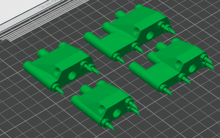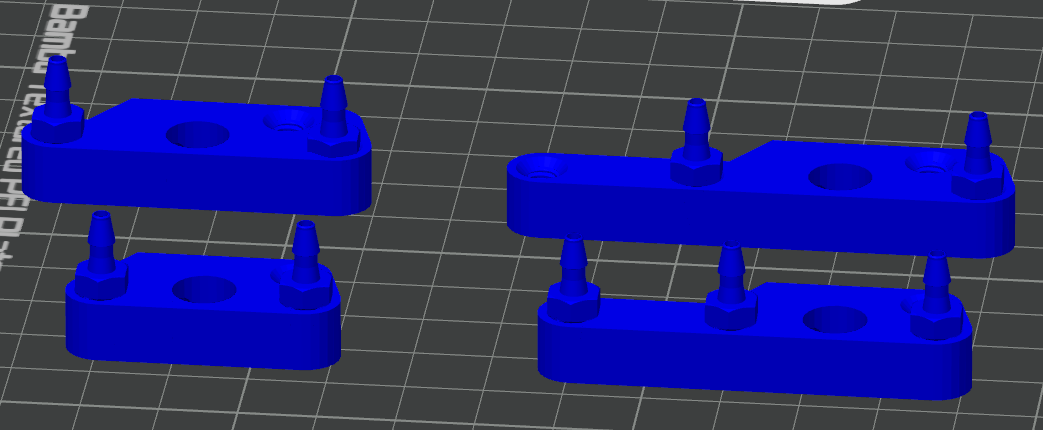 I liked how the connections came out so I printed a set of mouthpieces with the adapters. I sent the file to Bambu. It came in with the adapters toughing the print plate and the mouthpieces facing up. I rotated them and then two mouthpieces were laying flat on the print plate and two were above. I used the split tool to separate the floating two from the laying two and them moved the floating two onto the print plate. This is a picture of the 4 mouthpieces in Bambu.