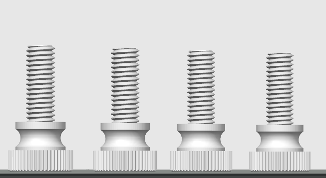 My plan then become to scale the screws down in Bambu. I made 4 different scale test, as this portion of the project would be trial and error. The first was 100% scale, the second was 98%, then 96%, and 94%. Below is a picture of the 4 screw trials in Bambu:
